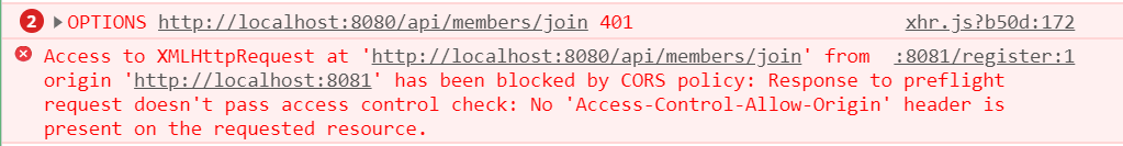 해석해 보면 preflight요청이 Access-Control-Allow-Origin 헤더가 없어서 통과하지 못했다는 것이다.